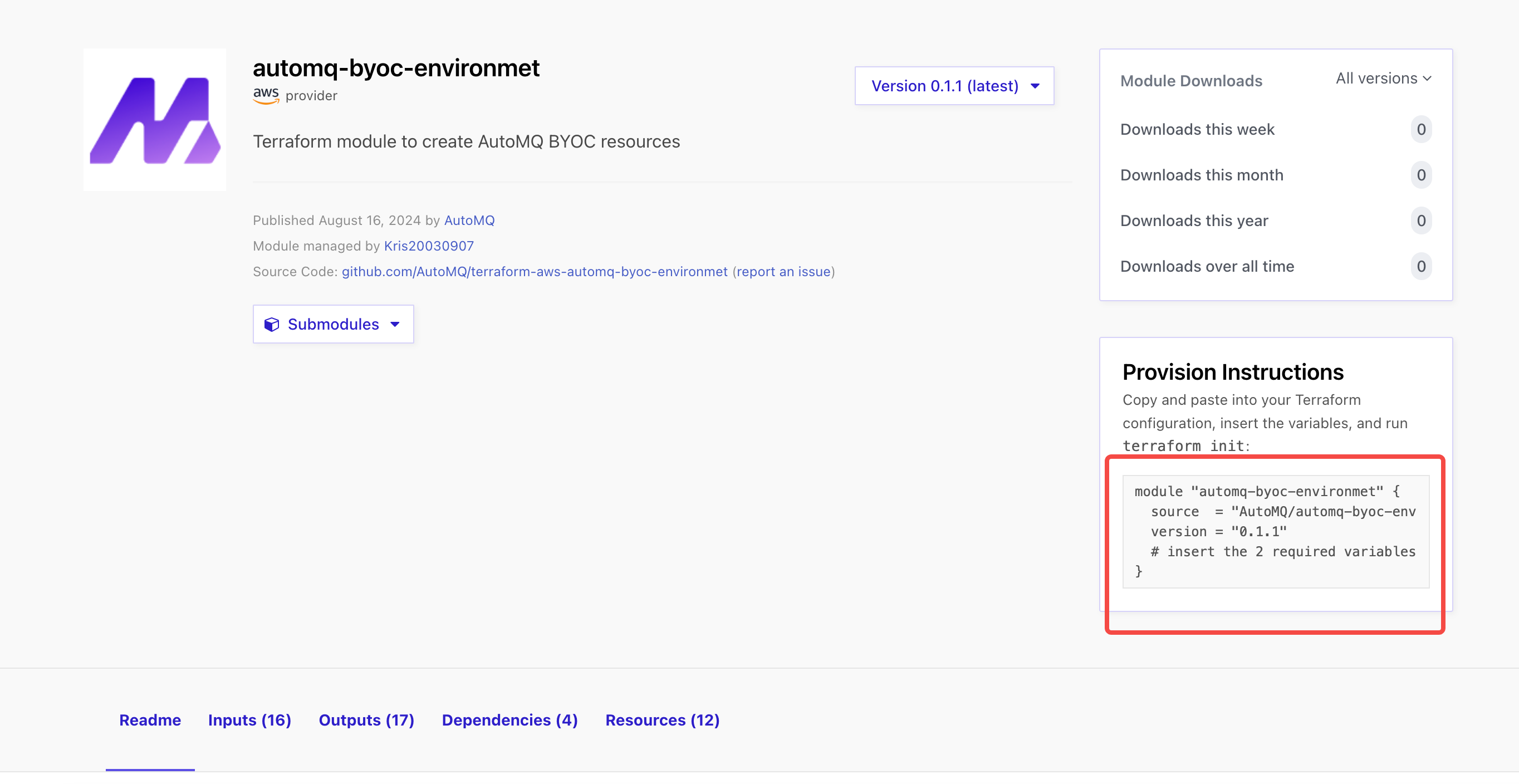 - Access the AutoMQ Terraform Modules Repository to obtain the Modules dependencies, and refer to the corresponding README document to execute the creation operations.