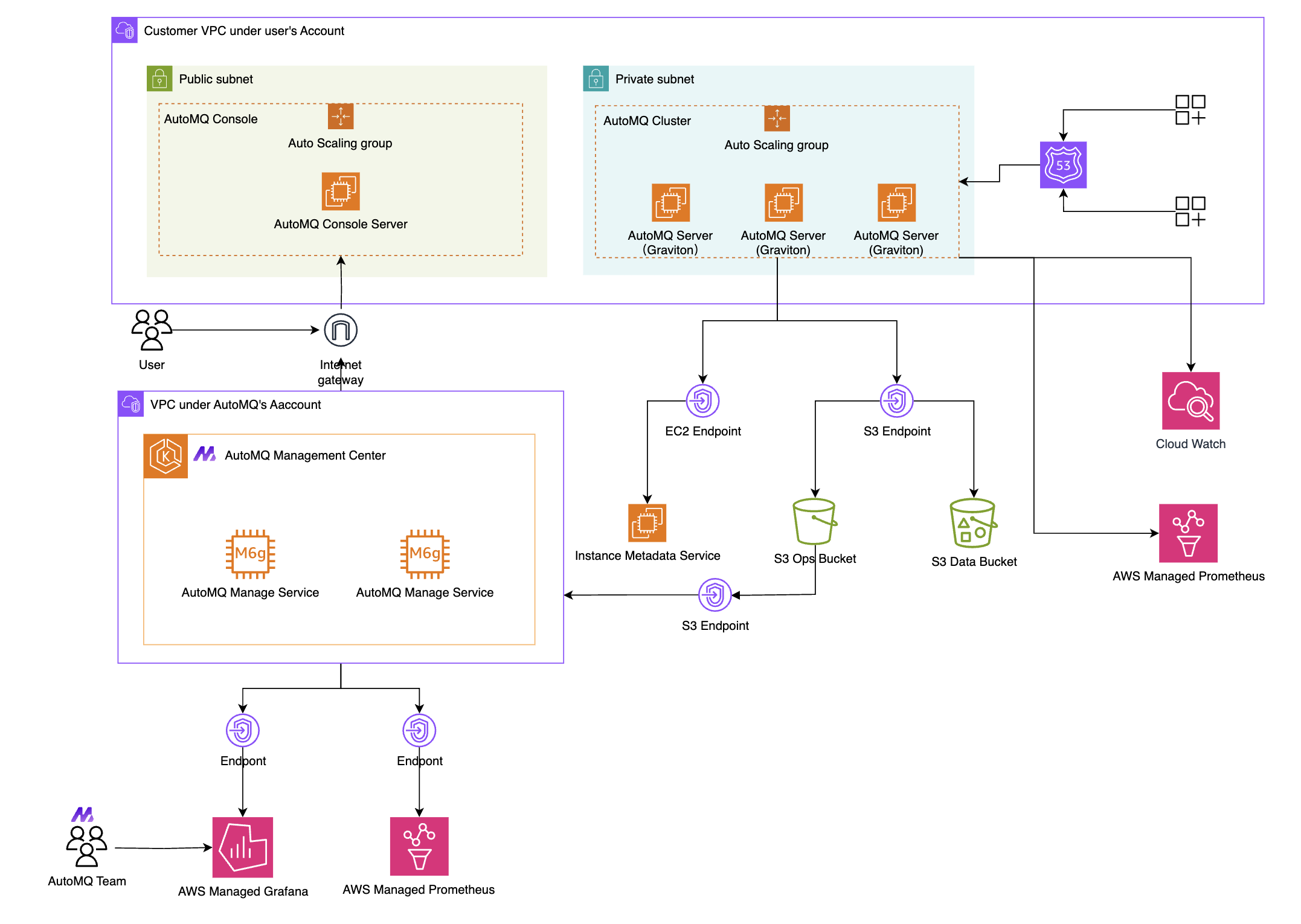 - The overall deployment architecture diagram of AutoMQ on AWS is as follows: