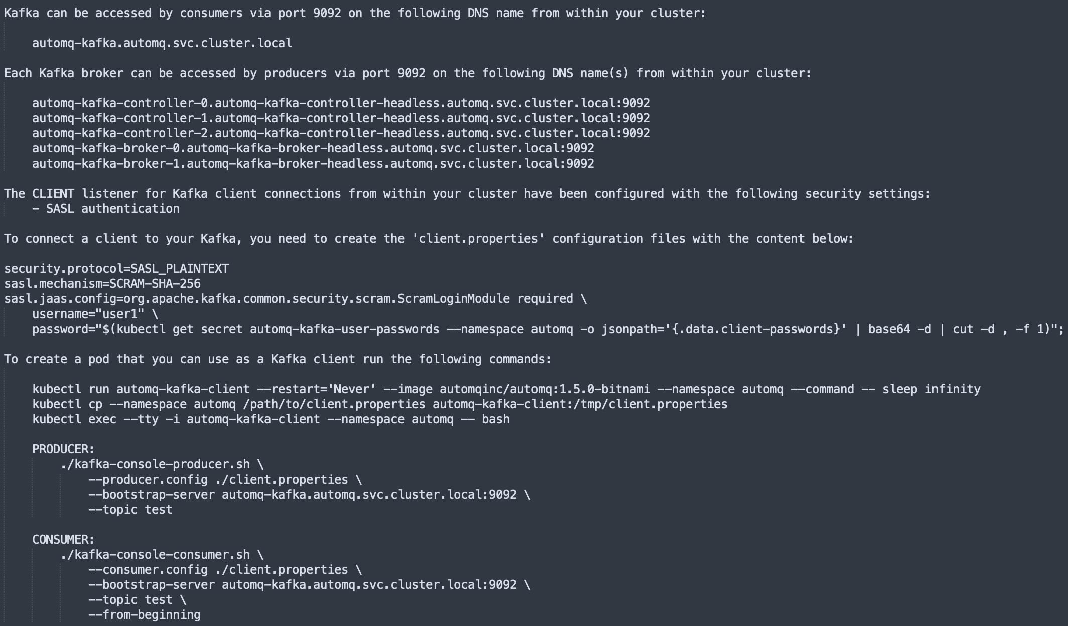 After the Helm execution is complete, the access address for the cluster and the commands for testing message sending and receiving will be displayed. This allows you to perform Topic message sending and consumption tests usingkafka-console-producer.sh