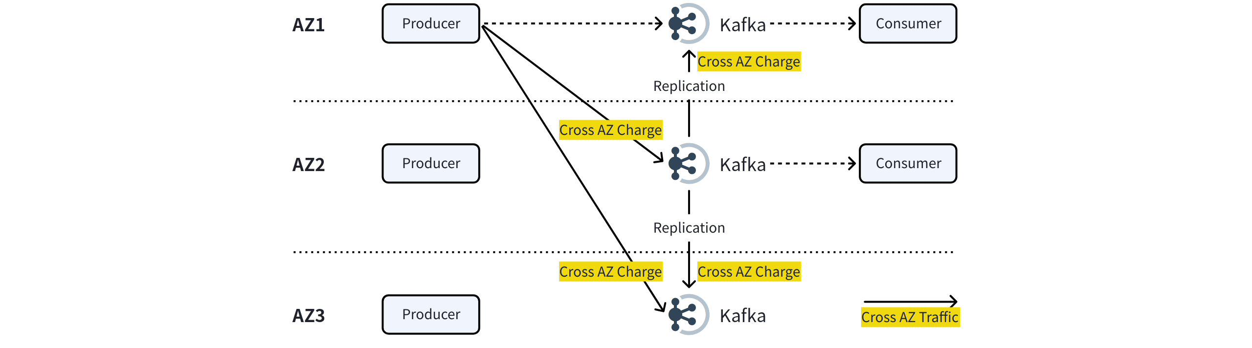 When users deploy Apache Kafka across multiple AZs in AWS or GCP cloud environments, enabling multi-AZ service disaster recovery also introduces Inter-Zone data transmission costs. In large-scale clusters, these traffic costs can account for 60-70%.- Inter-Zone Production Traffic: If the Producer has not specified a ShardingKey, and partitions are distributed equally across cluster nodes, at least two-thirds of the Producer’s traffic will traverse across AZs. For instance, Producers located in AZ1 will route one-third of their traffic to both AZ2 and AZ3.