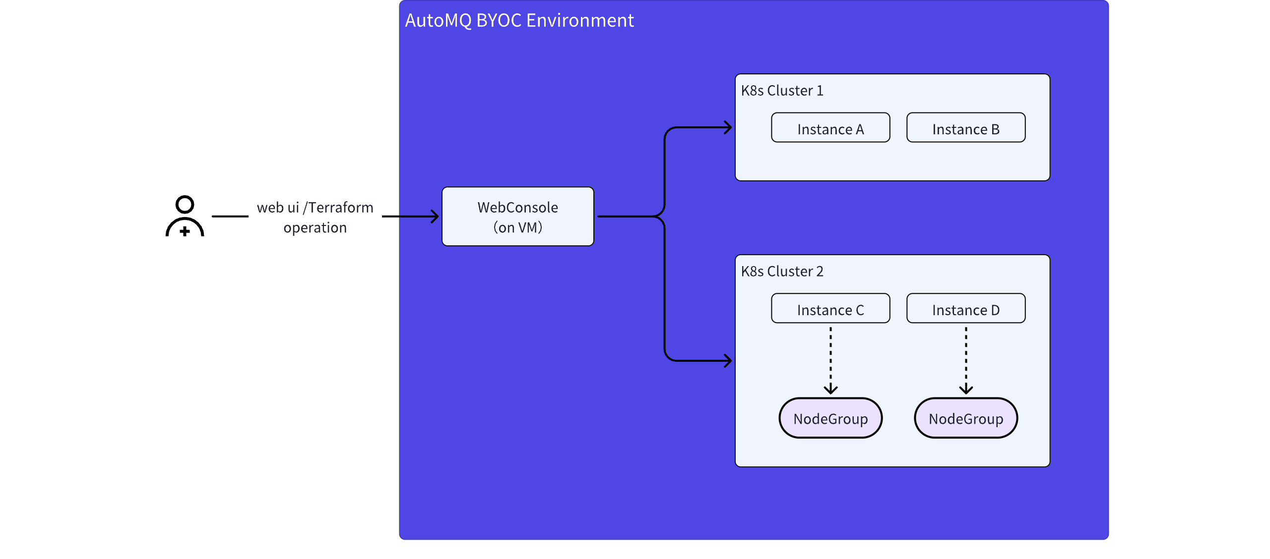 - 用户通过 AutoMQ 控制台提供的 WebUI 或者 Terraform Provider 管理环境内实例的生命周期。