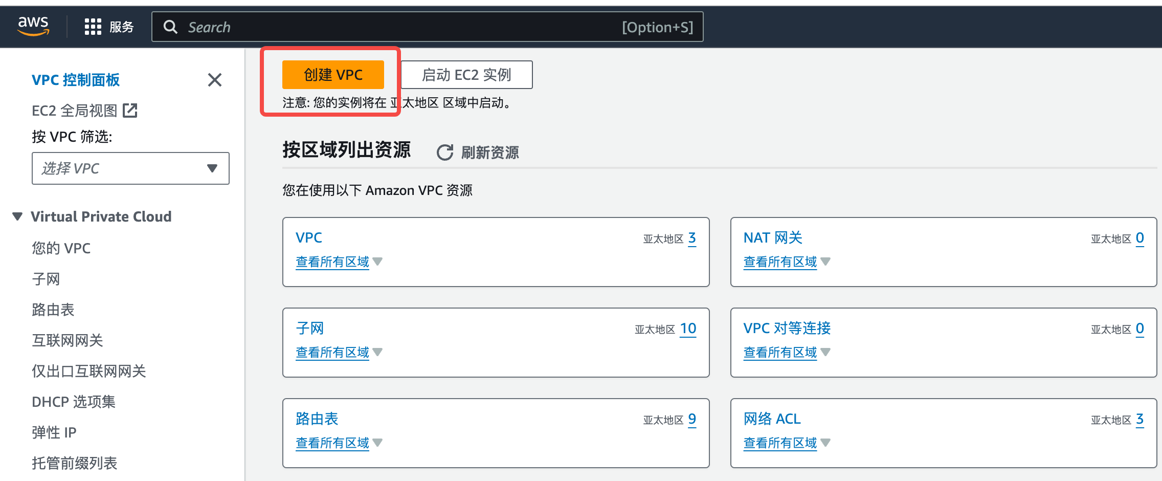 使用 AWS 云账号登录 VPC 控制台,以新加坡地域为例,访问 VPC 控制台,点击创建 VPC。