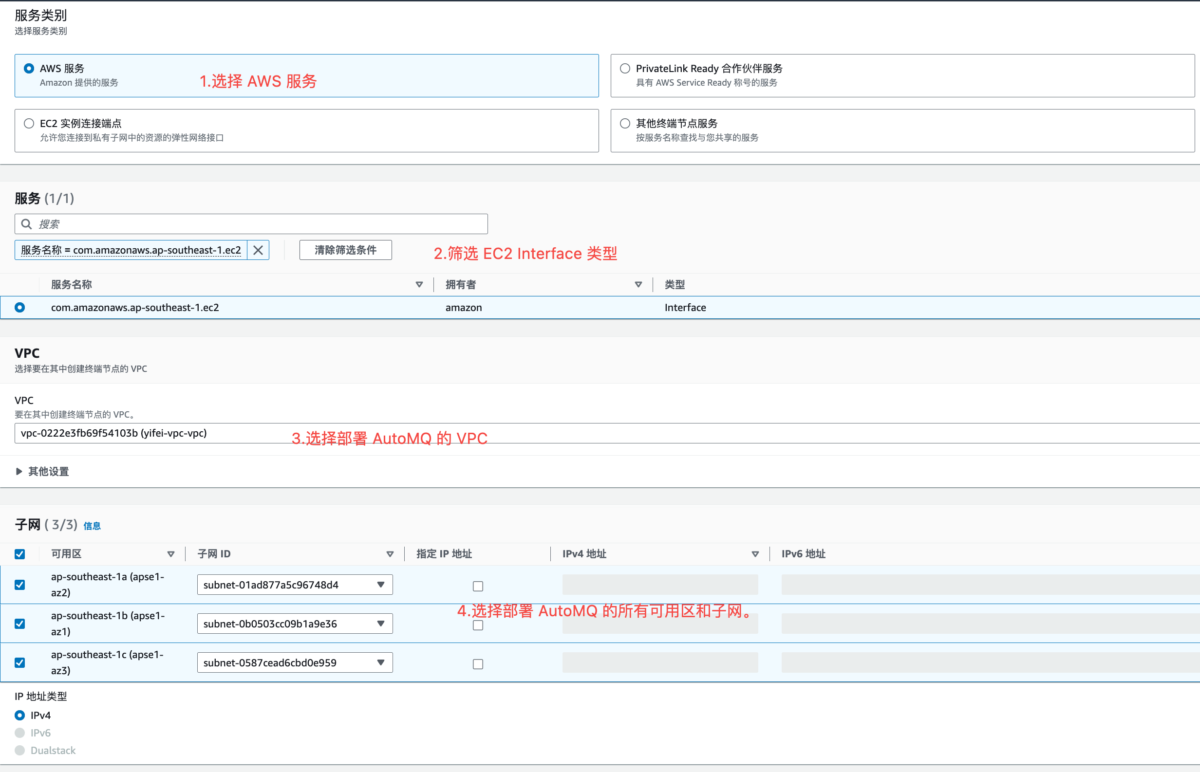 AutoMQ 集群运行需要通过 VPC 内网访问 EC2 API,因此创建 EC2 Endpoint 时需要确保可用区子网配置以及安全组配置务必完整,否则会导致 AutoMQ 集群无法启动。必须覆盖所有计划部署 AutoMQ 集群的子网和可用区,不能遗漏可能的子网。安全组规则必须确保 443 端口和访问来源畅通,建议允许通过0.0.0.0/0 来源。