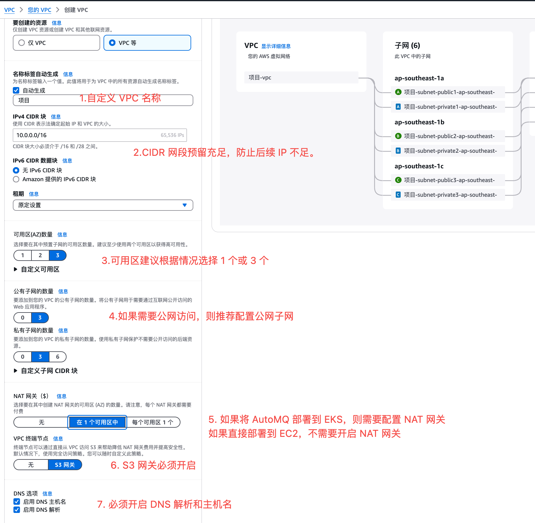 - NAT 网关:如果将 AutoMQ 部署到 EKS,则需要开启 NAT 网关 。
