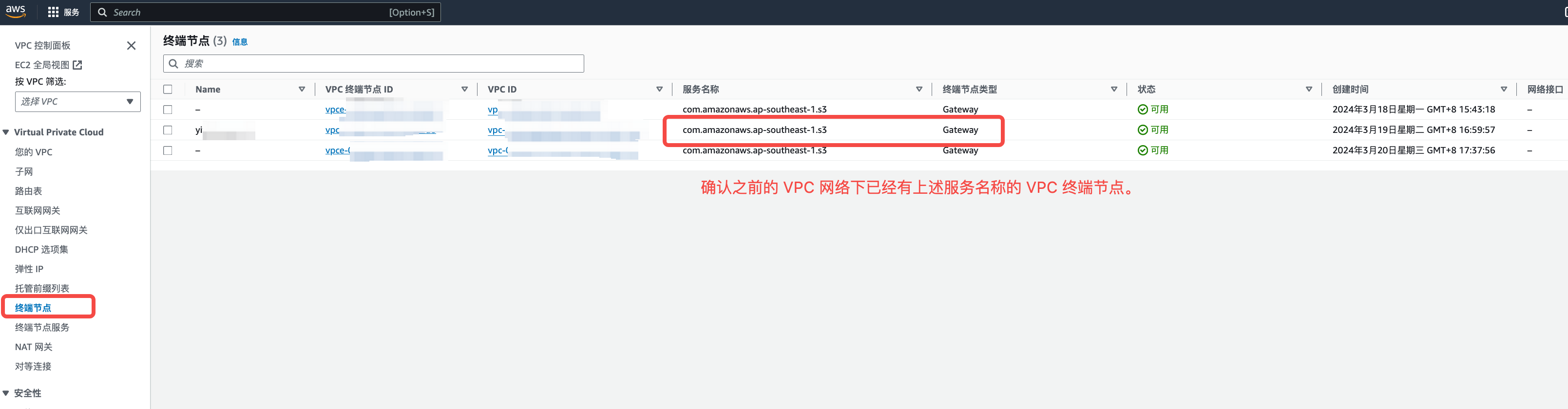 确认当前 VPC 是否已经创建 S3 网关型终端节点,如果没有 S3 终端节点,则需要创建。