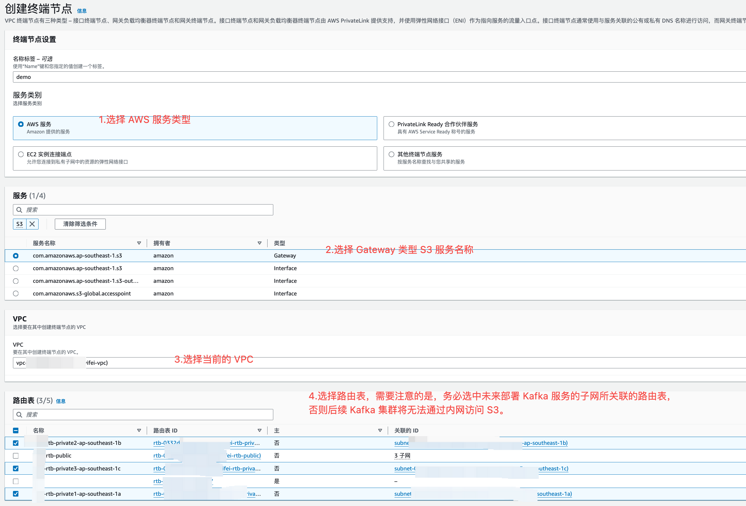 需要注意的是,创建 S3 终端节点时,添加路由表时,务必将当前 VPC 下所有可能部署 Kafka 集群的子网全部覆盖,否则后续 Kafka 集群将无法通过内网访问 S3 服务。