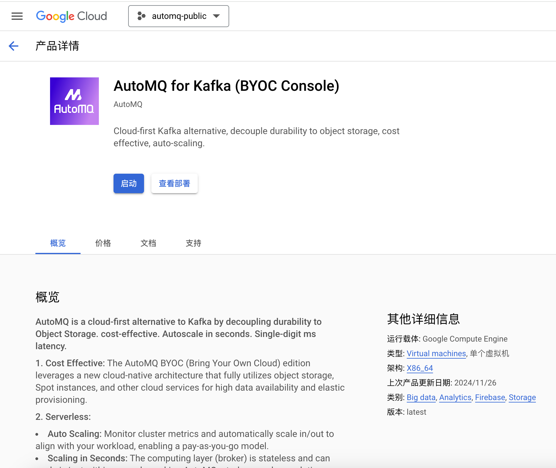 - 访问 AutoMQ 应用链接。 AutoMQ Cloud BYOC 环境在 Google Cloud 上默认是通过Marketplace 提供分发,用户可以从Marketplace 搜索 AutoMQ。