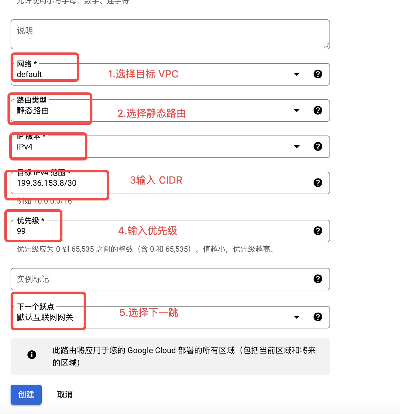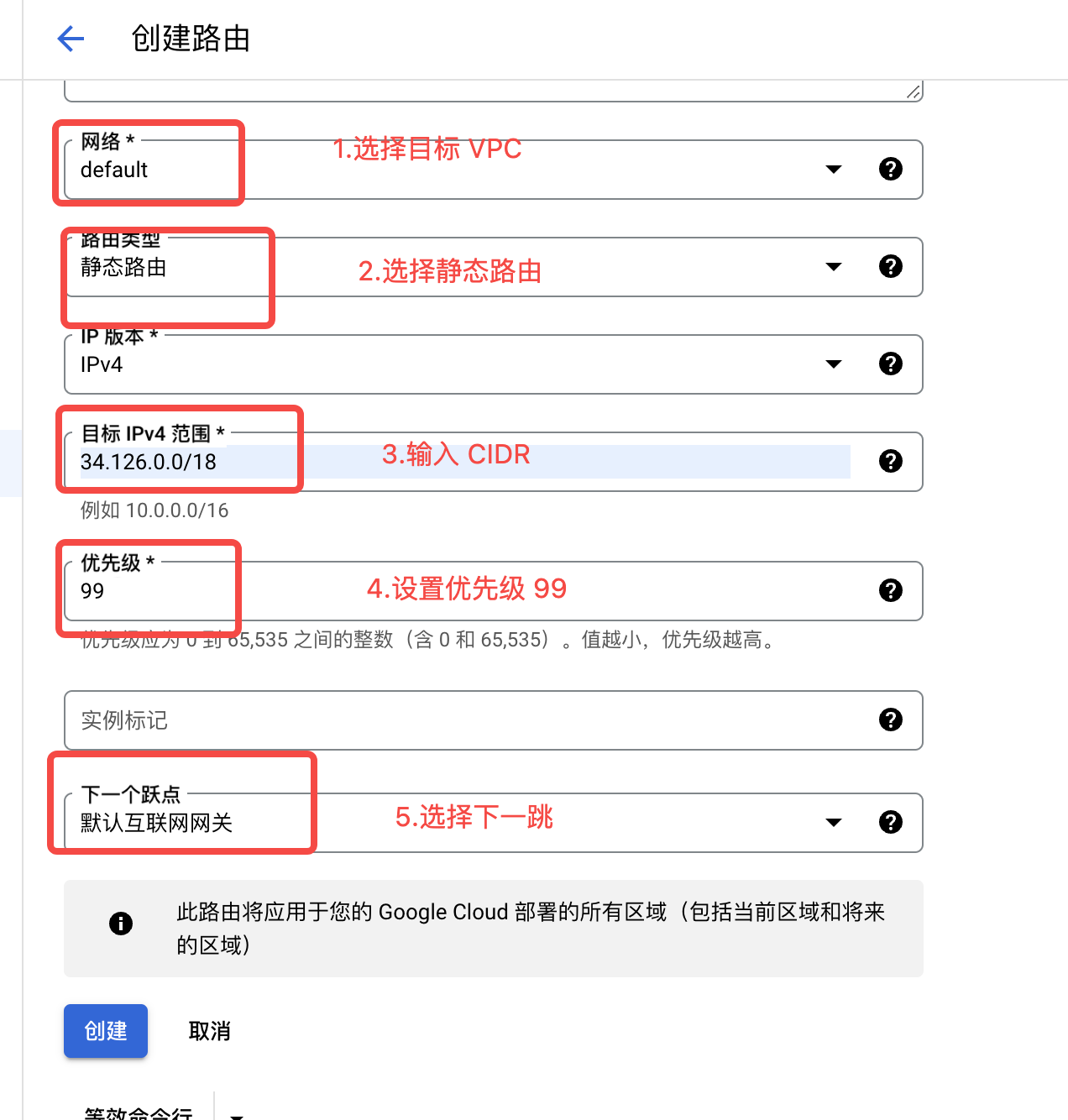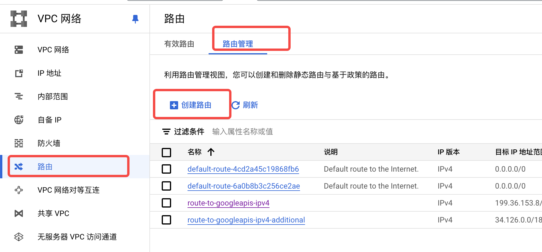 - 前往目标 VPC,查看路由表。添加对 Google API 的访问路由。