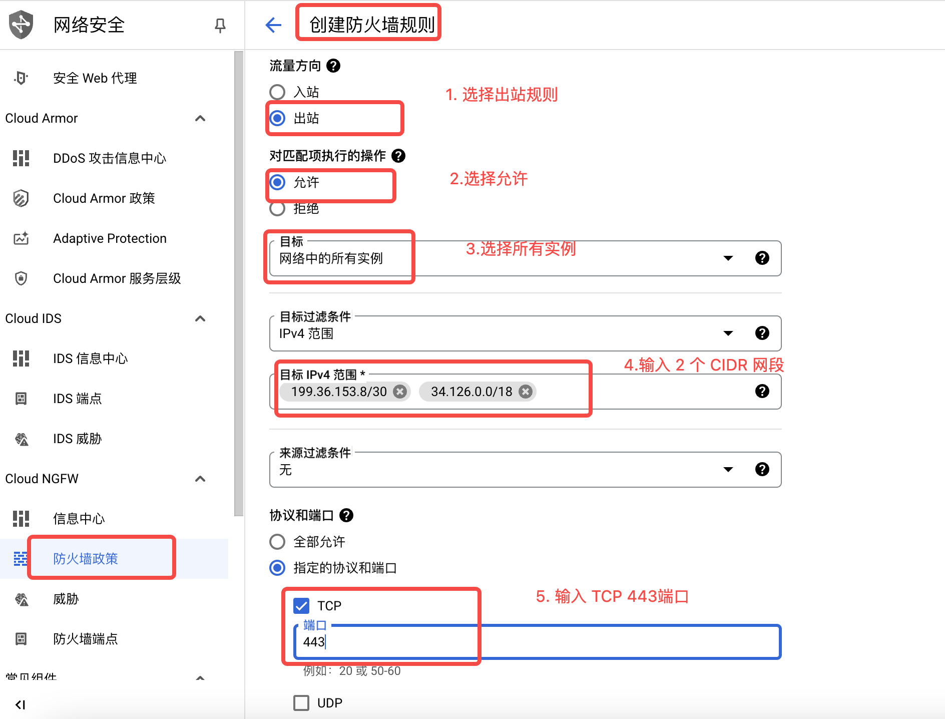 - 添加防火墙规则。VPC 路由添加完成后,需要在 VPC 内添加防火墙规则放行网段