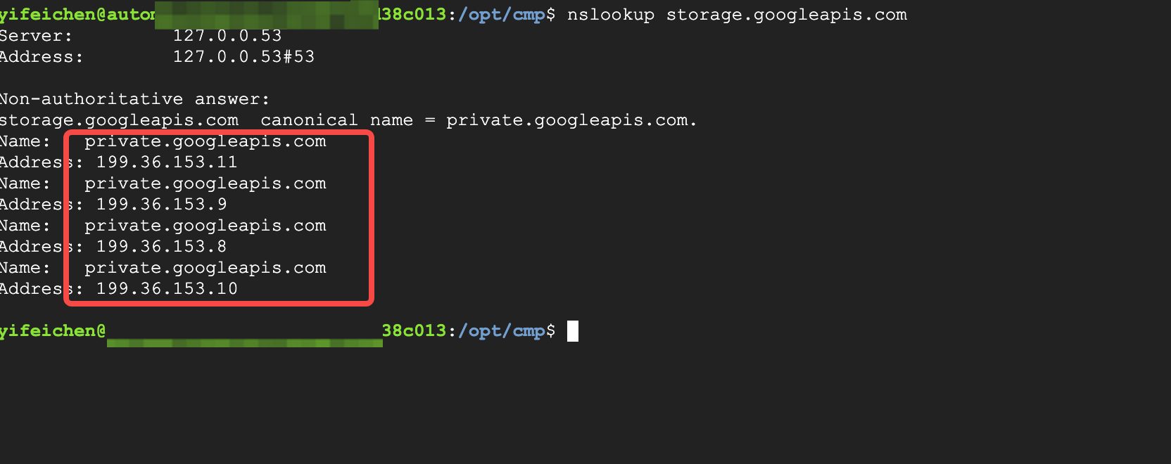 - 进入 VPC 内的虚拟机,测试访问 GCS 等云服务,查看访问地址,确认已经生效为上述步骤配置的私网地址。