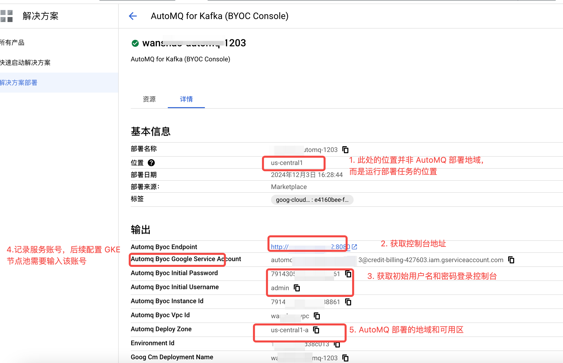 注意:Google Cloud Solution Deployments 中 Basic Info 展示的 Location 代表当前资源栈的运行地域,并非 AutoMQ 部署的地域。 实际 AutoMQ 部署的地域是Automq Deploy Zone。 |