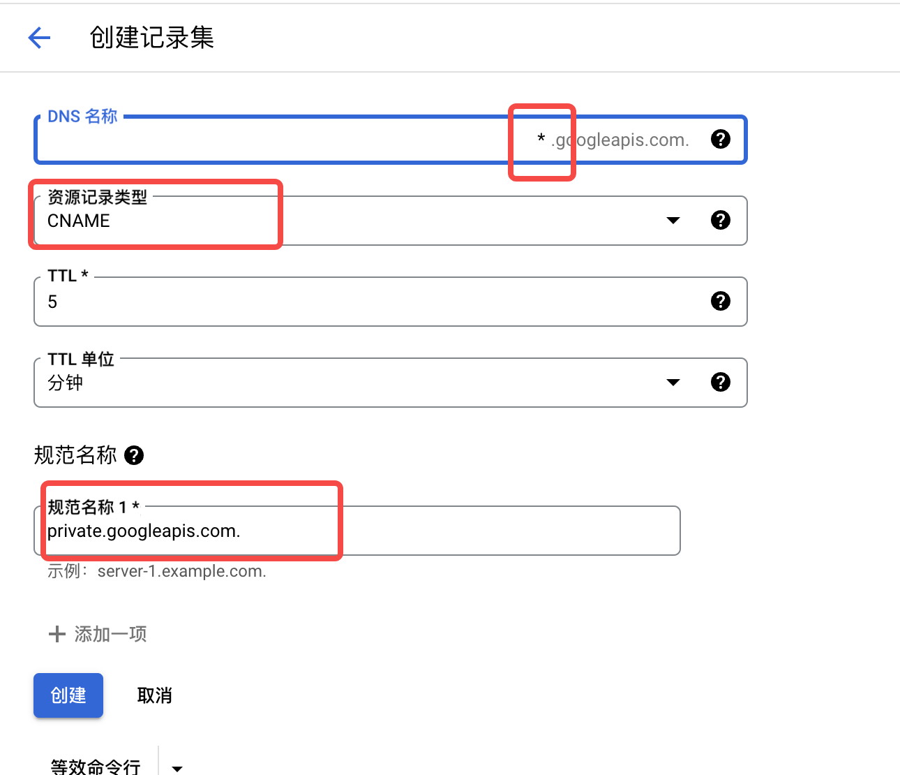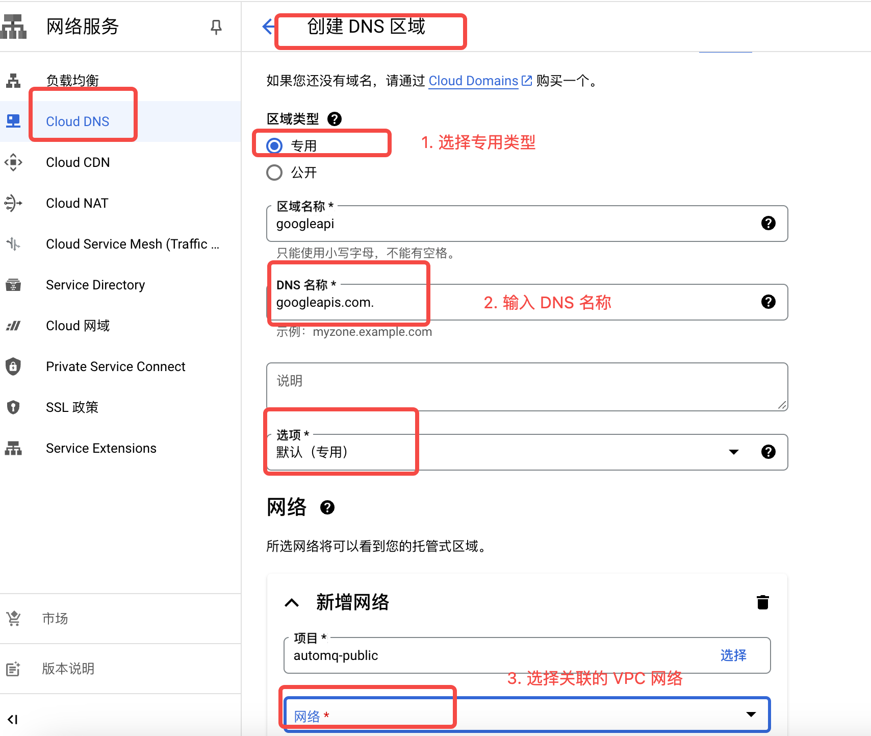 Google Cloud 中云服务 API 的默认域名解析到公网地址,如果在 VPC 内访问云服务,默认是从公网访问。 AutoMQ 需要大量访问 GCS 存储,为避免从公网访问产生不必要的公网流量费用,建议客户在 VPC 层面配置私网访问 Google API。配置方法参考下方步骤:- 前往 Cloud DNS 产品控制台,创建 Private DNS Zone 。其中参数如下: