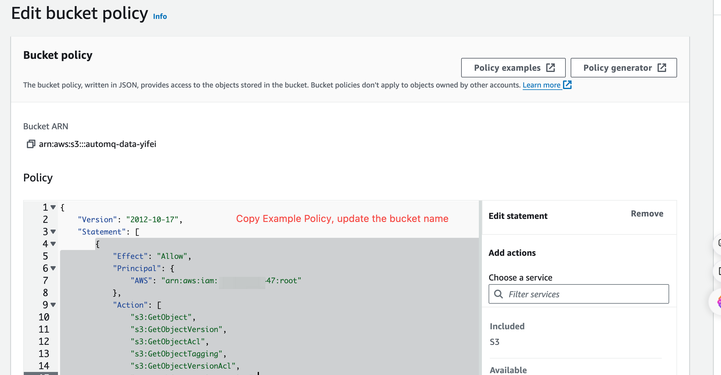 参考管理环境运维授权▸,使用AutoMQ Cloud BYOC 产品的过程中,AutoMQ 服务方需要用户提供相应的运维授权。本文档介绍如何在 AWS S3 配置代运维授权。