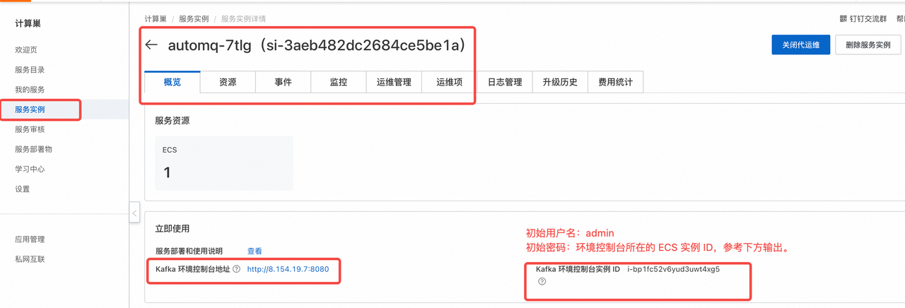 在阿里云环境,使用云市场(计算巢)部署 BYOC 环境,在部署完成后,请前往计算巢控制台 服务实例》我的服务实例》私有部署服务, 查看初始密码。