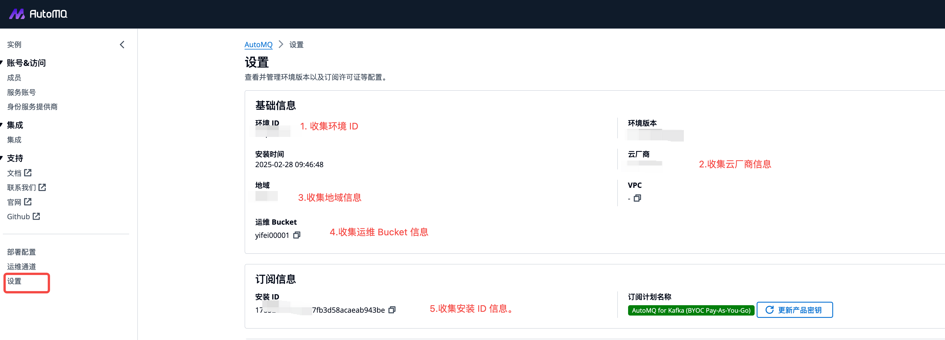 参考前置条件,购买订阅和激活之前,建议先完成 AutoMQ 环境控制台的安装,登录之前安装的 AutoMQ 环境控制台 -> 设置页面 ,收集安装 ID 等信息。