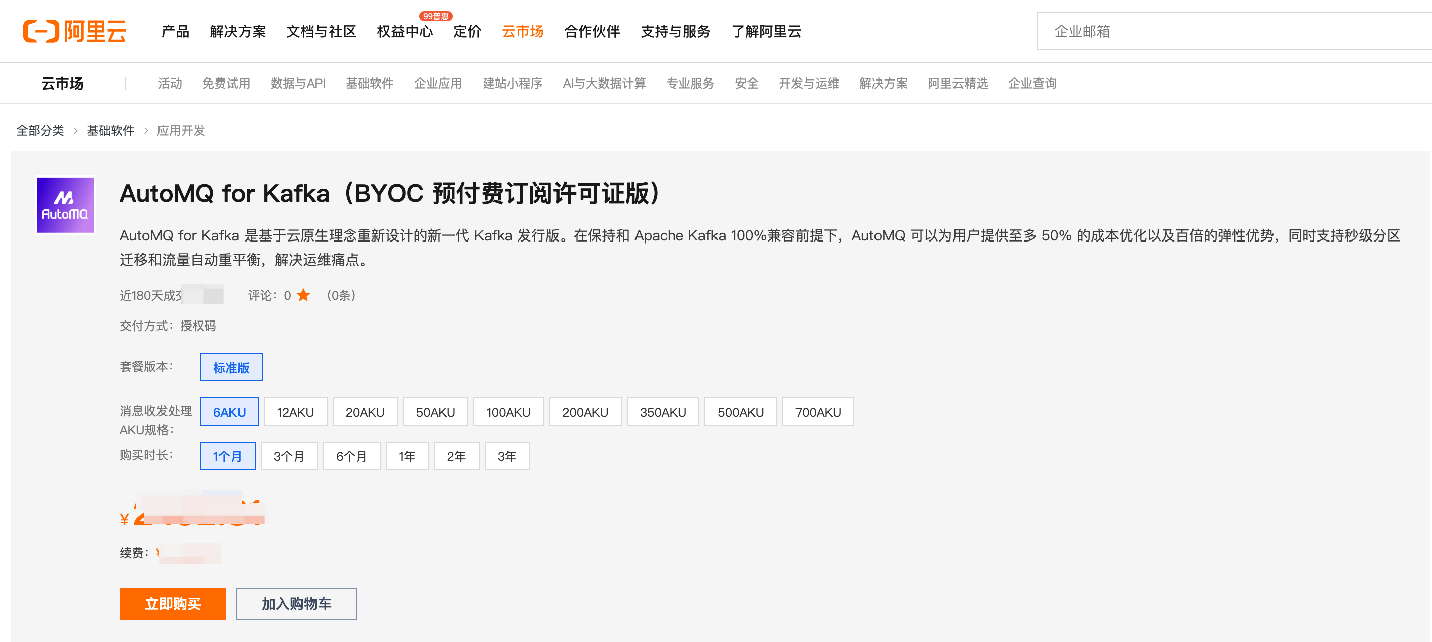 AutoMQ Cloud BYOC 版预付费订阅许可证商品目前已经入驻 阿里云云市场》基础软件》应用开发类目 ,商品名称为 AutoMQ for Kafka(BYOC 预付费订阅许可证版)。整体使用流程如下图所示:- 阿里云用户可以前往云市场搜索AutoMQ 或 Kafka,找到 AutoMQ for Kafka(BYOC 预付费订阅许可证版)商品,选择合适的规格版本和订阅周期,购买授权码。