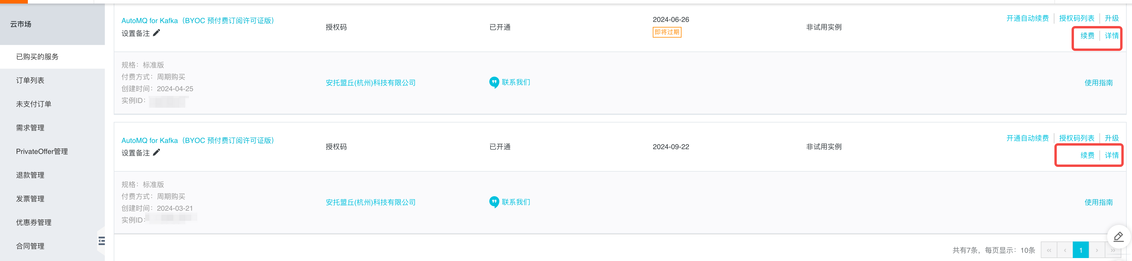 参考新购流程,如果前期购买的订阅许可证无法覆盖环境内的资源规模时,环境无法创建新的实例,也无法对既有实例进行扩容。此时需要对当前订阅许可证进行变配。- 使用云账号前往云市场买家控制台 -> 已购买的服务 详情,查看授权码信息。